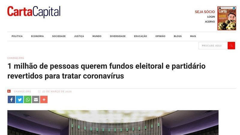 Equipe Change.org acaba de compartilhar uma atualização no abaixo-assinado "O dinheiro dos fundos eleitoral e partidário devem ser usados no combate ao Coronavírus!". Dê uma olhada e deixe um comentário: